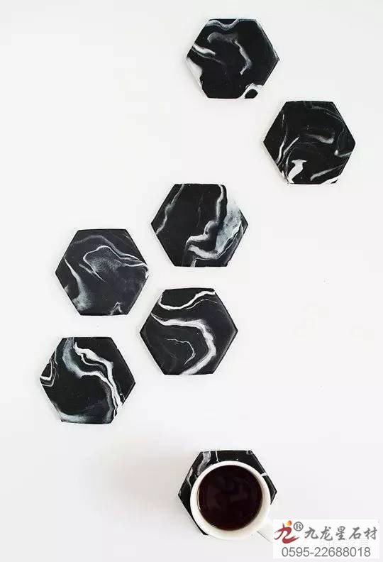 ↑六角形黑色大理石花紋的杯墊深邃又有型,拼起來還可以做隔熱餐墊,實(shí)用又好看。