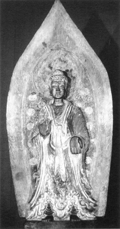 北魏彌勒佛石雕,定年516,著色、鍍金石灰?guī)r,現(xiàn)藏賓大博物館。圖片來源:Stanley K. Abe, “From Stone to Sculpture”, p.9.