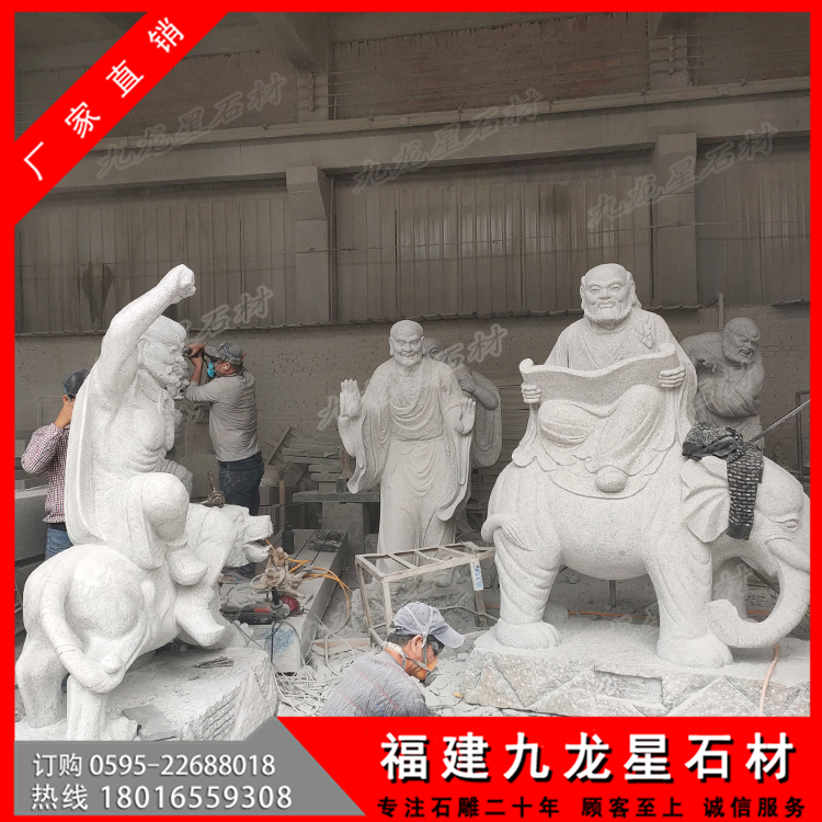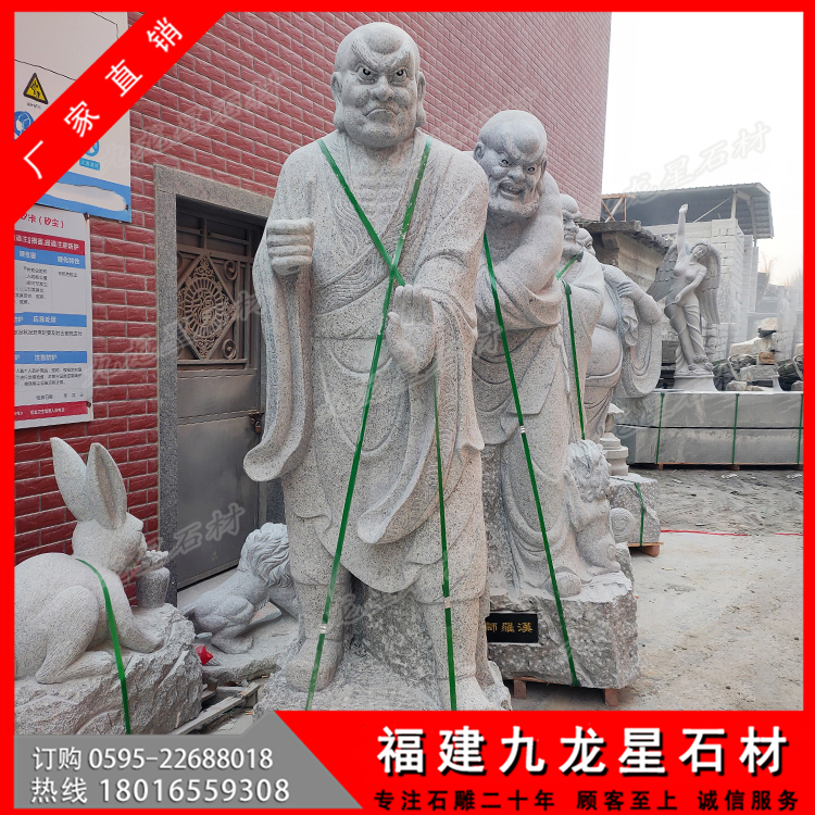 看著每一尊寺院十八羅漢石像,不得不感嘆古人的智慧啊。這些被珍藏的十八羅漢塑像,保存的如此完好,這還是要歸功于,十八羅漢塑像是采用的天然石材手工雕刻而成,純天然的石頭在大自然中被人們開鑿來制作成十八羅漢石像作品,這樣的一整套十八羅漢作品,不僅帶著天地精華,也將人們的智慧和工藝賦予其中,石刻十八羅漢就是最好的安排了吧。古代十八羅漢帶有歷史沉淀的韻味,具有很高的研究價值。而現(xiàn)代十八羅漢雕刻為了能有這樣的一份感情,開始了對石雕18羅漢仿古做舊的技術,也更符合一些古建筑,古剎寺院去擺放仿古代石雕十八羅漢擺件。