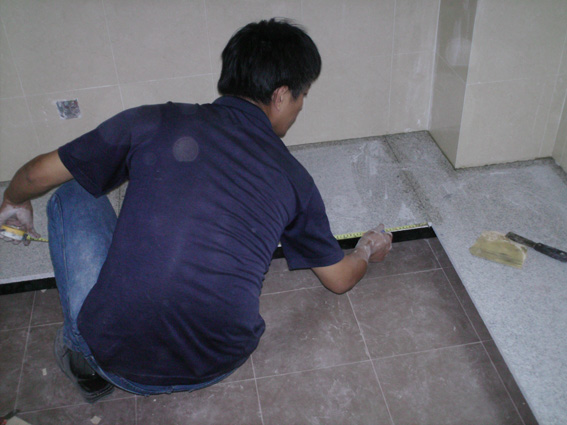 4、鋪貼時,水泥砂漿應飽滿地抹在陶瓷地面磚背面,鋪貼后用橡皮棰敲實。同時,用水平尺檢查校正,擦凈表面水泥砂漿。