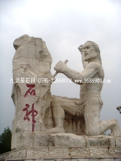 高臺(tái)中央為“石神”:以漢白玉為料,沿基座通高9.9米,重210噸?!笆瘛币鉃閷W(xué)習(xí)汲取先人堅(jiān)韌品質(zhì)、智慧,激勵(lì)當(dāng)代大石窩人民更好傳承大石窩悠久燦爛的石雕文化。