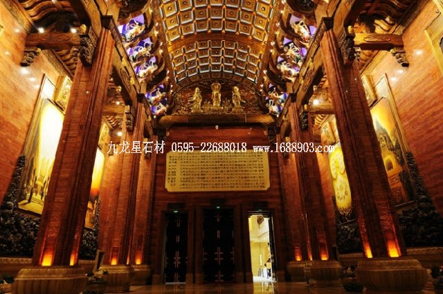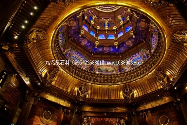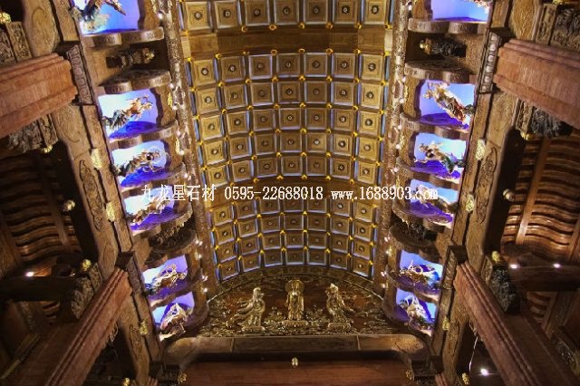 梵宮的內(nèi)部,舉目可見東陽木雕、敦煌壁畫、揚州漆器、景泰藍、琉璃、溫州甌塑等等藝術珍品。能將如此眾多的中國非物質(zhì)文化遺產(chǎn)納入一座建筑的,目前似乎只有梵宮,也因此,有人稱它為“東方的盧浮宮”。由于梵宮顛覆了中式宗教建筑的傳統(tǒng)理念,舍棄了中國傳統(tǒng)佛教建筑慣用的木頭、琉璃瓦等材料,而用鋼筋混凝土建造,因而為設計施工帶來了很大難度。