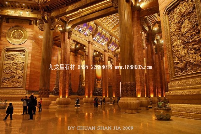 這些木雕均出自浙江東陽一班木雕藝人之手。浙江東陽是中國木雕之鄉(xiāng),北京故宮及蘇、杭、皖等地都有精美的東陽木雕留世。據(jù)統(tǒng)計,整座靈山梵宮的木雕裝飾面積達1.5萬平方米,用掉2400多立方米的原木。比如一座塔廳高就有65米,跨度為46.6米,面積為2000多平方米,這樣的空間規(guī)模在東陽木雕裝修工程中,從無先例,這比在故宮施工還要難!為此東陽幾乎傾全縣之力,42個廠家,1560多名工匠,從2007年底接手,連續(xù)制作1年零4個月才最終順利完工。