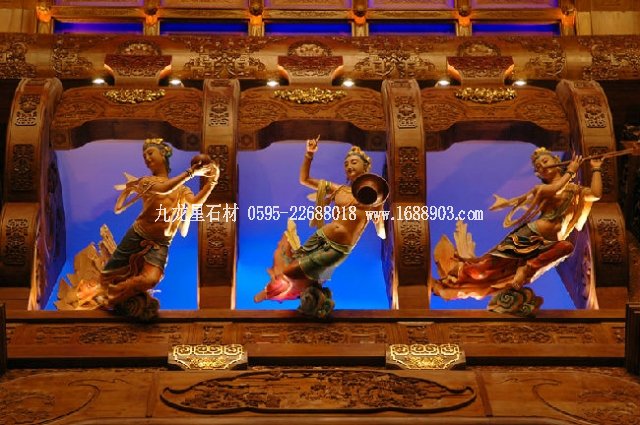 廊廳頂部藻井兩側(cè)為12組32座仕女飛天雕像,彩云飛之欲出,讓人如臨仙境