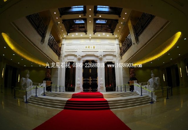 門廳是梵宮的交通集散樞紐。門廳面寬約110米,進深18米;東側(cè)通道通往餐飲區(qū)域,西側(cè)通道通往會議區(qū)域。正面三扇仿石窟造型的金色大門是梵宮主入口,通往廊廳。整個門廳主色調(diào)呈佛教傳統(tǒng)的明黃色,給人以平靜祥和之感。漢白玉鋪就的地面清新典雅,莊嚴而古樸,透明的四格天窗與下方的圓壇遙相呼應,柔和而自然。陳列于門廳兩側(cè)高達3.8米的東陽木雕精品“和諧雙瓶”,為東陽木雕傳人陸光正大師的問鼎之作,寓意和諧美好。