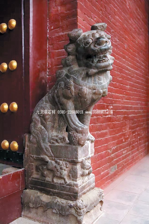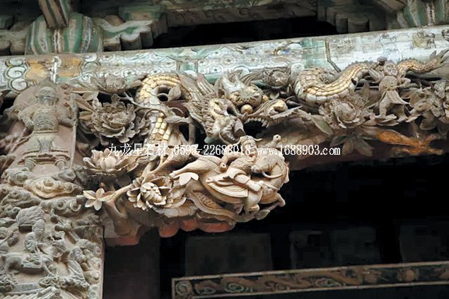 關(guān)帝殿前廊上的四根滾龍透雕石柱氣勢非凡。柱礎(chǔ)雕琢的是威猛的石雕獅子,柱礎(chǔ)上矗立四根透雕石柱。每根石柱上都纏繞著兩條巨龍,這種雕工手法俗稱“滾龍透花柱”。石雕刻工精細,將龍的強健威儀刻畫得栩栩如生。在關(guān)帝殿橫梁上,門楣上,廊檐上,磚墻上,還有石雕龍、木雕龍、磚雕龍、琉璃龍,大大小小幾十條龍攀附在廊柱上,整個大殿變成了神龍世界,把中國龍文化展示得淋漓盡致。