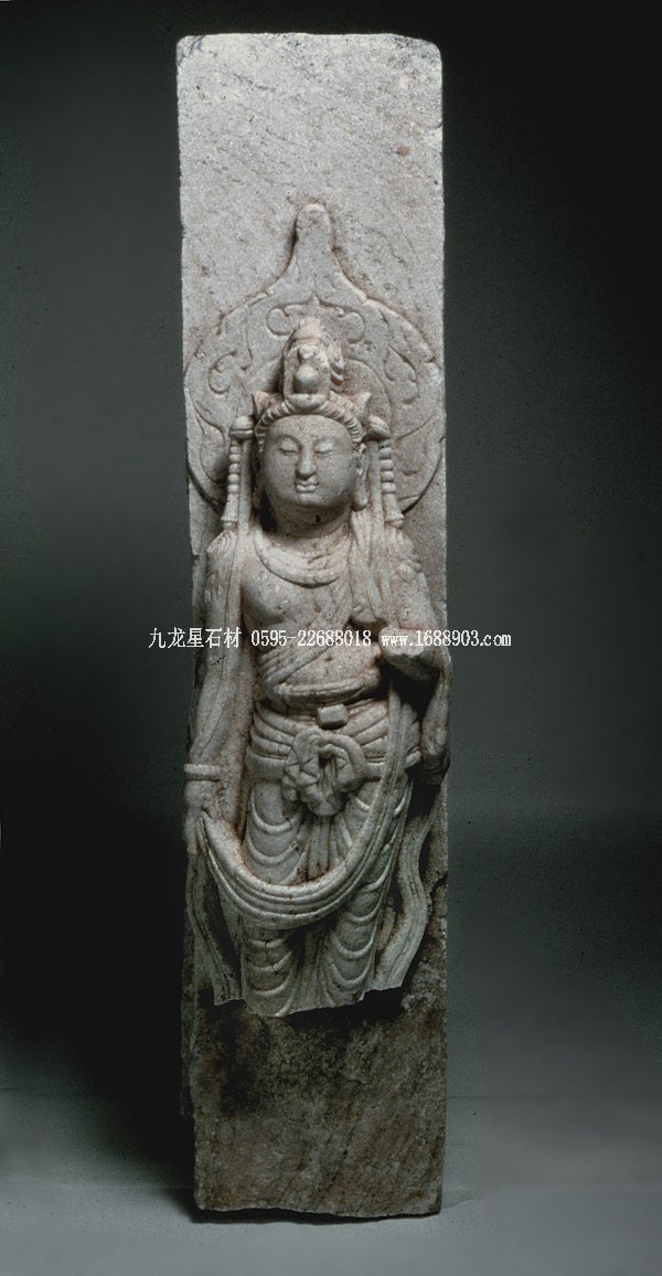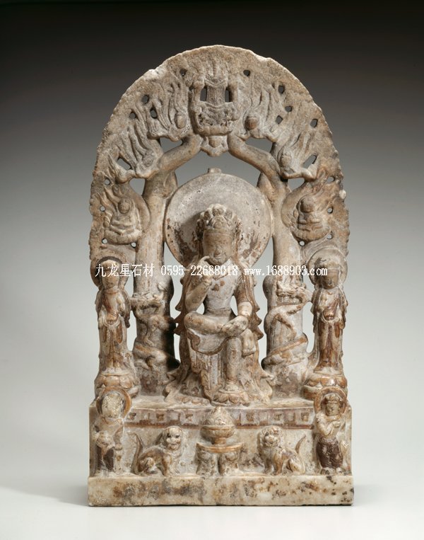 館藏思維彌勒像雖運(yùn)用成規(guī)的造像碑格式和構(gòu)圖,但設(shè)計(jì)制作別具一格。用鏤空技法雕出一庭園背景,為白色的大理石作品更增添了一種清新和輕盈的視覺(jué)效果。彌勒左腳踩蓮座,半跏趺坐于兩棵大樹(shù)之間。樹(shù)干有龍盤(pán)繞,兩樹(shù)枝葉相纏構(gòu)成圓拱形背屏,又有四飛天簇?fù)硪环剿谥醒搿_@些細(xì)節(jié)是彌勒經(jīng)典形象的描繪,彌勒在龍華樹(shù)下成佛,方塔即釋迦牟尼的舍利塔。蓮座和方塔象征彌勒是釋迦佛的繼承人。彌勒臉形方圓,戴頭冠和瓔珞,軀干和四肢分明,肩臂圓潤(rùn),薄裙貼體。兩旁有脅侍菩薩,腹部前凸,一腿側(cè)立,膝蓋略彎,作稍息站勢(shì),開(kāi)啟了后代菩薩形體造型的新風(fēng)尚。人物造型是漢化和受印度笈多佛雕(Gupta)風(fēng)格影響的產(chǎn)物。此尊造像是北齊時(shí)期題材和雕刻巧妙結(jié)合的典范。
