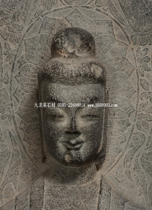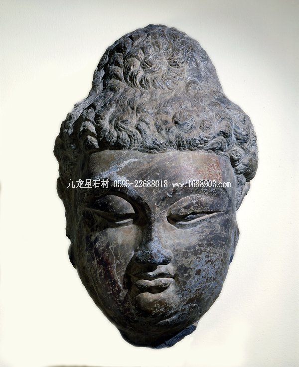 河南龍門(mén)石窟的擂鼓臺(tái)三洞建于武周和盛唐時(shí)期。館藏的佛頭像原屬其一洞窟中的大佛。佛有漩渦發(fā)型,高肉髻,臉龐圓潤(rùn)飽滿,眼呈俯視之態(tài),眼瞼微合,眼珠點(diǎn)黑彩,神態(tài)自信沉著。根據(jù)頭像的碩大尺寸可知原大佛應(yīng)高高在上。由此,若從仰視的角度再看這尊頭像,佛的容顏就變得更溫和親切,實(shí)可為原設(shè)計(jì)之本意。獨(dú)特的創(chuàng)意和純熟的雕刻技法,是盛唐造像得以具備高度寫(xiě)實(shí)性和表現(xiàn)性的原因。