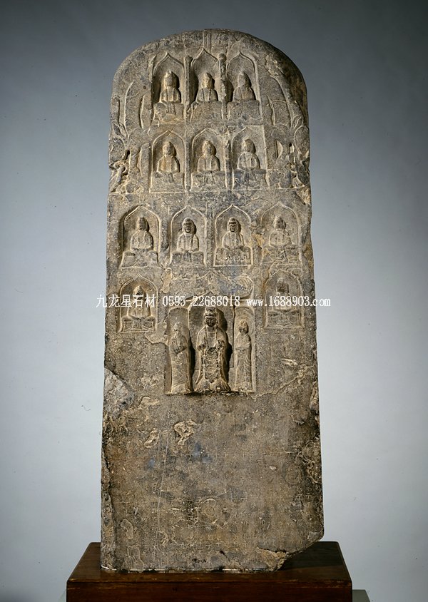 佛造像碑,西魏,公元549年,石灰?guī)r館藏的西魏石碑集兩種造像碑式樣于一體,即雙面數(shù)層佛龕式和千佛碑式。石碑正面是三段式構(gòu)圖。上段用減地陽(yáng)刻加陰刻的技法刻畫(huà)出維摩詰居士和文殊菩薩論法圖。人物刻畫(huà)秀骨清風(fēng),頗有魏晉名士風(fēng)流之韻。