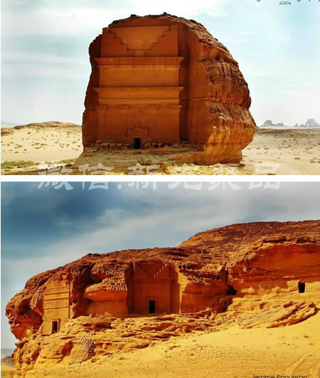 Mada’in Saleh 也被稱為Al-Hijr(巖石場(chǎng)),位于北漢志(今沙特阿拉伯),是猶太人和納巴泰人所居住的一座古老的城市,也被成為海格拉(詛咒之地)。這里被發(fā)現(xiàn)的一些銘文可追溯到公元前兩千年。然而,所有保留下來的建筑元素可以追溯至公元前1世紀(jì)和公元后第二個(gè)世紀(jì)的Thamudi,Lihyan和納巴泰文明時(shí)期。Mada’inSaleh不僅是沙特最壯觀的旅游景點(diǎn),它也是世界最偉大的歷史遺跡之一。在清晨的日光中,石墓呈現(xiàn)給人的是一種非凡的美麗,陽(yáng)光中投射下的影子和石墓形態(tài)各異,更給Mada’in Saleh真正增添了幾分魅力。其姊妹城市---佩特拉,納巴泰王國(guó)前首都,位于約旦邊境北部150公里。