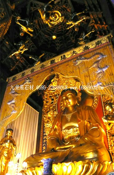 九龍殿:可以說是普陀山上龍文化的集大成之杰作。此殿在清康熙三十八年建成后,世稱“宏制巧構(gòu),甲于東南”,名聞天下。據(jù)史料記載,清康熙四年,普陀山曾遭荷蘭殖民主義者侵占和掠奪,法雨寺殿宇被毀。三十八年經(jīng)康熙恩準(zhǔn),將金陵故宮的琉璃瓦和舊殿九龍?jiān)寰疬w于此,故而此殿的來歷不同凡響。為目前國(guó)內(nèi)寺院建筑中規(guī)模最高的一座佛殿,亦是法雨寺的主殿。九龍殿的特點(diǎn),重檐黃瓦,宏偉深廣,殿頂內(nèi)槽九龍?jiān)寰?穹窿成拱形,一龍盤頂,八龍環(huán)繞八根垂柱懸空而下,昂首舞爪,搶抓居中懸掛的琉璃燈,形成九龍搶珠之勢(shì)。其造型之生動(dòng),工藝之精巧,堪稱普陀一絕。在九龍殿中還有48根柱磉,均為透雕蟠龍,隆鼻斜眼,張發(fā)伸爪,各呈異態(tài),更使九龍殿增添了龍文化的風(fēng)韻和色彩。 也許是九龍殿的名氣太大了,歷代名人或文人所寫的楹聯(lián)、匾額、詩詞頗多,亦可能是歷代名人的眾多作品,因此進(jìn)一步提高了九龍殿的知名度,或許兩者兼而有之。如新編的《普陀山志》的楹聯(lián)篇中寫九龍殿的就有七條,占法雨寺佛殿之首。其中有菲律賓華僑葉健民、施佩君合家敬獻(xiàn)的“天華降錦屏,九龍殿中騰光輝;法雨潤(rùn)靈鷲,白華山上顯感應(yīng)”,此為代表作之一。清朝金土奎的詩《法雨寺》中亦有“九龍殿已偕山老,五門對(duì)海雄”等吟九龍殿的詩句等等,可見九龍殿影響之大。