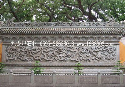 九龍壁:在法雨寺天王殿對(duì)面照墻處,1988年由溫嶺縣長(zhǎng)嶼鎮(zhèn)民間石雕工匠梁宗濤等人用質(zhì)地優(yōu)良的青石板精雕細(xì)刻而成。它是仿照北京故宮九龍壁,卻又不同于故宮、大同等地的陶制九龍壁。法雨寺九龍壁是用60塊70厘米見方的優(yōu)質(zhì)青石,精雕細(xì)鑿,拼接而成。有的石板上是半個(gè)龍頭,有的石板上是一只龍角,有的石板上是一只龍爪,拼接起來竟然不露縫隙,像是在一塊青石上雕刻而成。這不僅有濃厚的刀味,石趣,更顯示了民間雕匠的高超工藝。此座九龍壁高2米,長(zhǎng)12米,浮雕凸出16厘米。九條青龍騰飛于云山碧海之間,盤旋翻滾,爭(zhēng)奪龍珠,造型逼真,栩栩如生,富有立體感。而在梁與梁之間還雕有十七條造型各異的小龍,昂首舞爪,十分生動(dòng),更使這九龍壁群龍盤舞,似有龍將破壁,呼之欲出之感。此壁于1987年由香港同胞捐建。壁的東側(cè)還立有《新建九龍壁功德碑》,碑文曰:“法雨寺原有照壁,前有石牌檔,以條石和塊石為之?!虻鬲M樹大不相稱,始新建九龍壁,取龍?zhí)鞊碜o(hù)之說,且又與九龍殿相對(duì)稱,”云云。