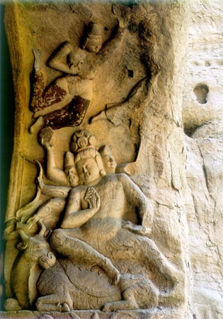 最饒有趣味的是第八窟拱門東側(cè)雕刻的摩醯首羅天和西側(cè)的鴻摩羅天,一個(gè)騎神牛三頭八臂,一個(gè)乘神鳥(niǎo)五頭六臂。這一組新奇神異的浮雕,不再是生命的寫實(shí),而是精神的寫意。游牧民族用審美的藝術(shù)形象折射生命現(xiàn)象中的“多頭多臂”,內(nèi)化為人類幻想生長(zhǎng)出更多的智慧頭腦和勇敢的手臂,去征服自然,以獲得自身生命的拓展與延伸。