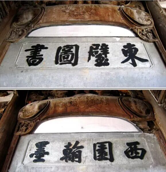 繼志堂正廳山墻前廊兩端的龍虎門,門額嵌青石匾,矩形框,剔地起突,陽(yáng)刻楷書黑漆:“東璧圖書”“西園翰墨”四字匾,字體遒勁有力。門額采用互文手法,比喻這個(gè)地方到處有古籍和文壇雅集,是很有文化氛圍的地方。此聯(lián)出典自唐代張說的《恩賜麗正殿書院賜宴應(yīng)制得林字》:“東璧圖書府,西園翰墨林?!睋?jù)史書載,漢代丞相蕭何在未央宮建天祿、石渠二閣,以藏歷代典籍和檔案文獻(xiàn)。魏晉時(shí)期建“西園”以宴建安七子,宋代馬遠(yuǎn)繪《西園雅集圖》傳世,米芾、張士奇作記。