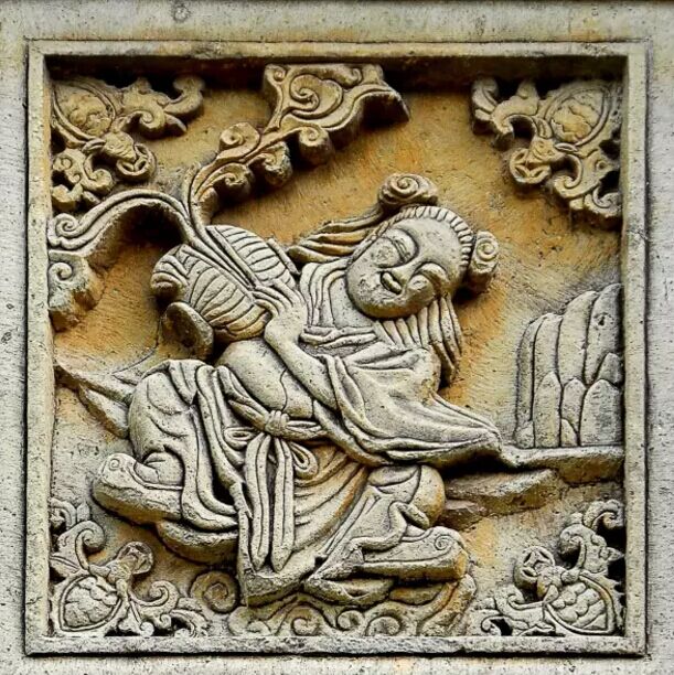 本譜石雕位于佛堂新屋里,取材于民間喜聞樂見的神話傳說。其原形相傳是唐代的萬回,象征家人和睦。宋代始作和合之神,主婚姻和合。圖中合仙捧圓盒,盒中吐納如意祥云紋。和仙手持荷花。兩位活潑可愛、頭梳元寶發(fā)髻、長(zhǎng)發(fā)披肩的孩童,笑容滿面,十分惹人喜愛。人們借此來祝賀新婚夫婦白頭偕老,永結(jié)同心,家人相親相愛,家庭和睦。四個(gè)岔角上蝙蝠銜一枚銅錢,寓意福祿雙全。