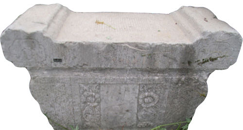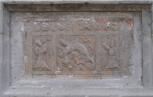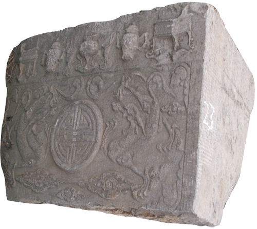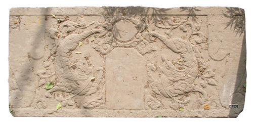 為分體式。桌裙四周刻邊框,框內(nèi)底部為海水波濤,中間有山石,即壽山福海;上部刻雙獅戲繡球。構(gòu)圖雖簡(jiǎn)單,但布局勻稱。造型準(zhǔn)確而動(dòng)感強(qiáng),突出了獅子的威猛。上有紀(jì)年款銘:嘉慶十九年(1814年)。