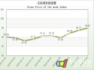 從4月石材周價(jià)格指數(shù)走勢(shì)圖看,本月石材周價(jià)格指數(shù)除2015-04-08期略下調(diào)外,總體基本呈現(xiàn)一路平緩?fù)粕淖邉?shì),價(jià)格循序漸進(jìn)調(diào)整。