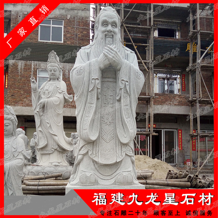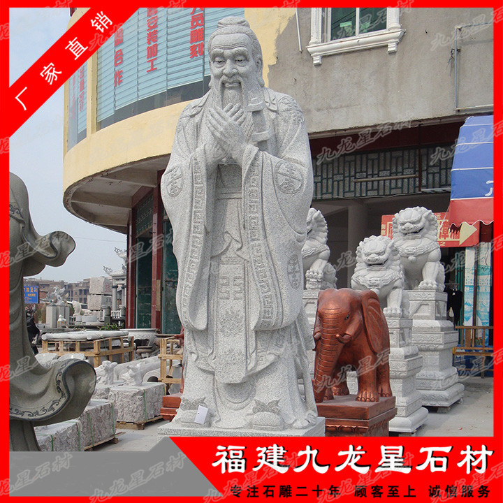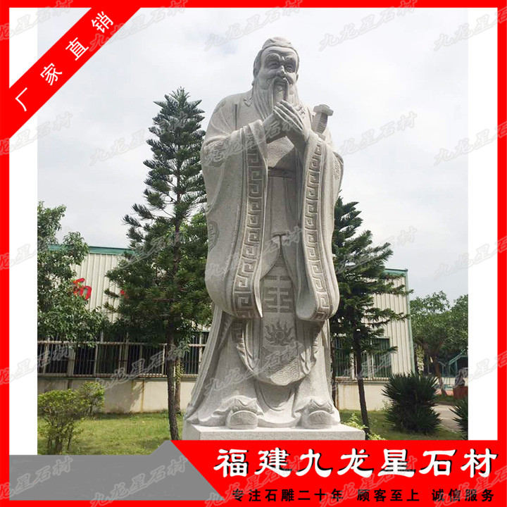 孔子石雕像樣式選擇性不算太大,現(xiàn)在我們看到的孔子形象大多是根據(jù)唐朝的吳道子所畫的孔子像來進行創(chuàng)作雕刻的,長眉長須,身著寬大的儒服,衣袂飄飄,栩栩如生,因此非??简灥窨處煾档墓に?,達到石雕像的真實感,表情惟妙惟肖。一般比較常見的孔子石雕像有比較簡單的頭像,也有站姿的石雕像,基本上站立姿勢的石雕像選擇性更受到人們喜愛,有手里握著書卷拿在胸前,一手背在身后,抬頭挺胸,眼神眺望的石像,也有將雙手交叉并在胸前,但是我們可以看到交疊的手是不露出大拇指的,象征著謙恭有禮,而四指并攏,也代表著四海之內(nèi)皆兄弟,有著友愛、友誼的象征意義。