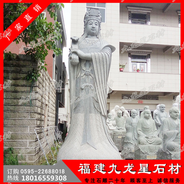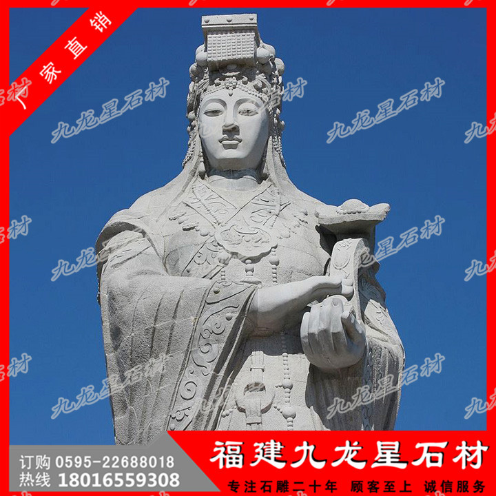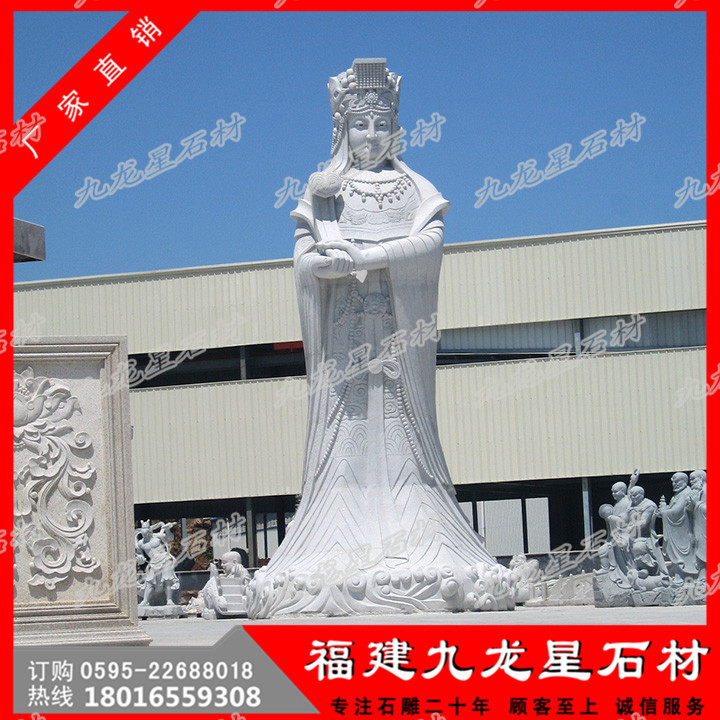 大型石雕媽祖中國民間在海上航行要先在船舶啟航前要先祭媽祖,祈求保佑順風(fēng)和安全,在船舶上立媽祖神位供奉。這就是“有海水處有華人,華人到處有媽祖”的真實(shí)寫照。而影響所及,媽祖由航海關(guān)系而演變?yōu)椤昂I瘛?、“護(hù)航女神”等,因此形成了海洋文化史中最重要的中國民間信仰崇拜神之一。