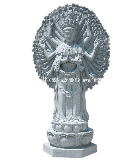 石雕千手觀音含蓮花底座總高度2.36米。千手千眼觀音,又稱千眼千臂觀音,簡稱千手觀音。千手表示護持一切眾生,千眼表示觀照一切眾生,有大慈大悲、法力無邊的意思。千手觀音的來歷佛經里有記載。相傳在久遠的過 ...